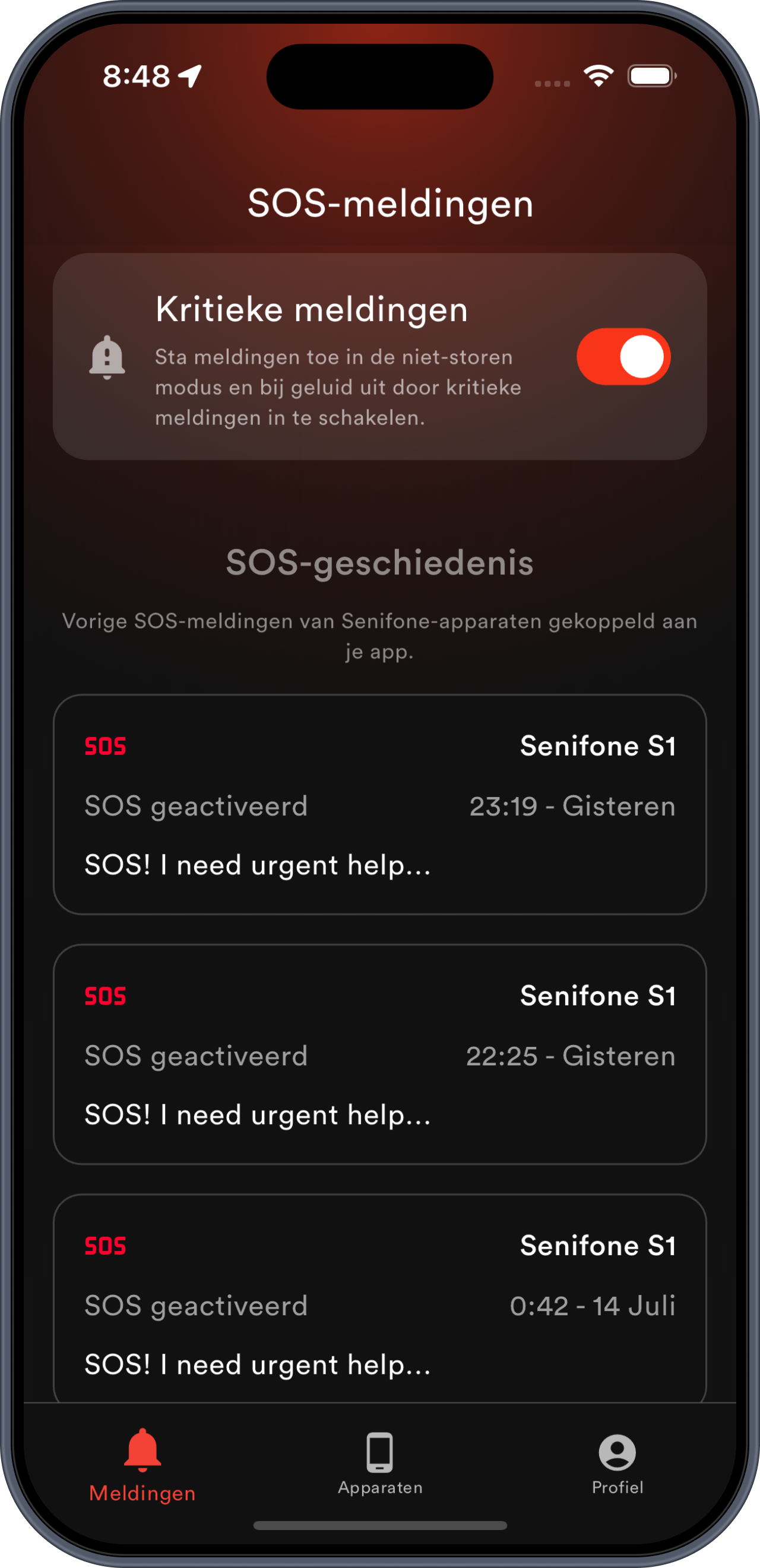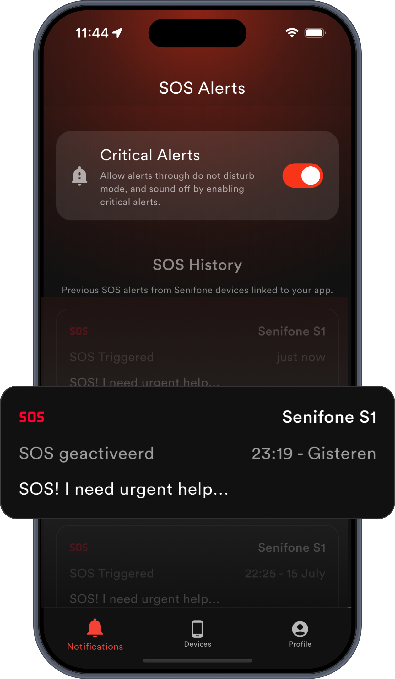 Erhalten Sie sofort eine Meldung, wenn der Akku niedrig ist oder SOS ausgeloest wird - sogar im Bitte-nicht-stoeren-Modus.