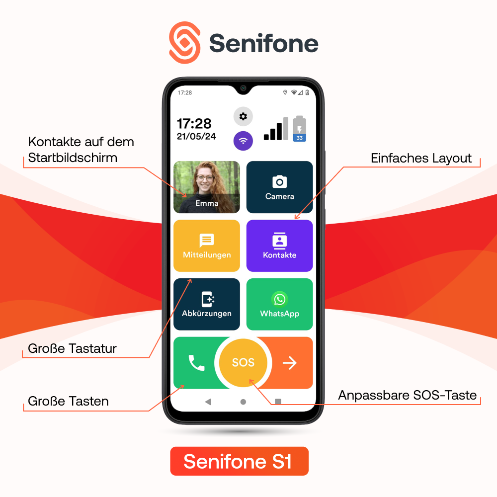 Das Senifone S1 ist kein gewöhnliches Smartphone. Es ist ein Stück zusätzliche Sicherheit, das Sie immer bei sich tragen. Mit einem Knopfdruck erreichen Sie Ihre Liebsten, fühlen sich durch die SOS-Funktion geschützt und bleiben ganz einfach verbunden. Keine Sorgen mehr über komplizierte Menüs oder Technik, sondern Ruhe, Freiheit und das Vertrauen, nie allein zu sein.