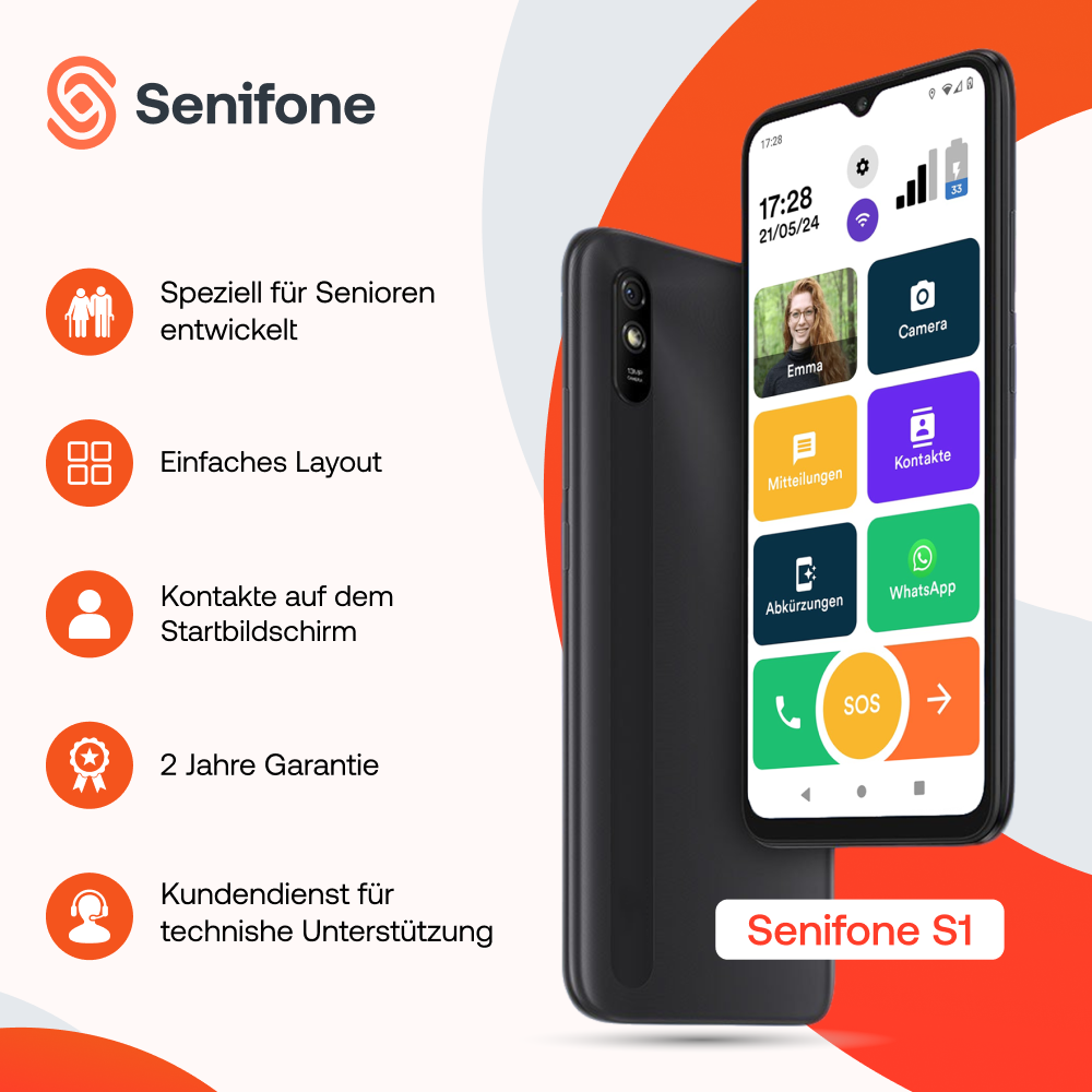 Das Senifone S1 wurde speziell für diejenigen entwickelt, die keine Lust auf komplizierte Menüs, zu kleine Tasten oder unklare Einstellungen haben. Große Tasten, klarer Text, Shortcuts zu Ihren Kontakten, Videoanrufe, SOS-Funktion und Fernunterstützung - all das ist vorhanden. Einfach, sicher und vertraut für Sie oder Ihre Lieben.